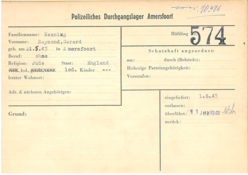 Op 17 mei 1943 arriveerde ineens een groep van 573 Joodse gevangenen in Kamp Amersfoort. Om 3:00 uur die nacht waren zij in Kamp Westerbork in een gereedstaande passagierstrein geklommen die om 6:00 uur binnen reed op het stationsemplacement van Amersfoort. Na ruim een uur durende voettocht door de stad kwamen deze mensen eindelijk bepakt en bezakt aan in het aan de zuidrand gelegen Kamp Amersfoort.1 Onder hen bevonden zich de in Amsterdam geboren kapper Hartog Kesnig (gevangene nummer 213; 1914-1985) en zijn in Antwerpen geboren vrouw Esther Kesnig-van Loggem (# 214; 1923-1996), die hoogzwanger was van hun eerste kind. Zij hadden op de Blasiusstraat 75 II gewoond en de dameskapperszaak van Hartog bevond zich aan de Weesperstraat 60.2 Binnen de familie ging het verhaal dat een buurvrouw hen had verraden.
