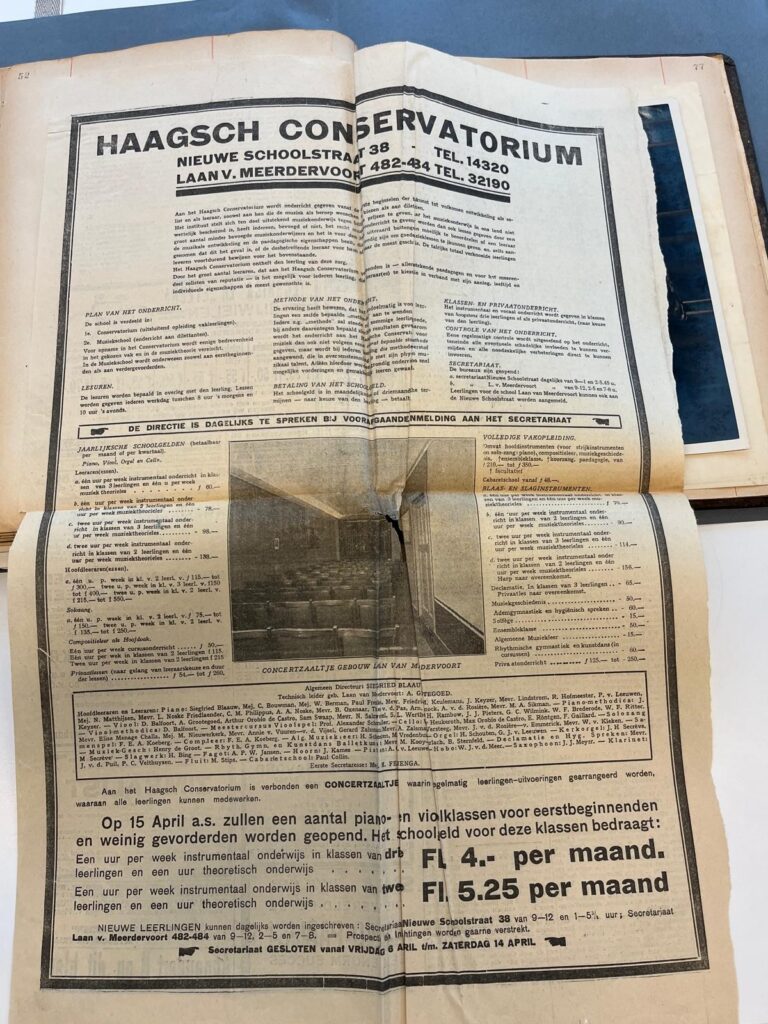 Vele krantenberichten geven inzicht in organisatorische aspecten van de muziekopleiding onder directeur Blaauw. Zo werd regelmatig geadverteerd met de aangeboden leergangen door het Haagsch Conservatorium.17 Ook werd aangekondigd dat de eerste prijs van een vioolconcours op 16 januari 1927 voor de beste leerling van het Haagsch Conservatorium een viool was; een jaar eerder betrof het een vleugel voor pianisten.18 Het aantal cursisten bedroeg in september 1925 al 723.19