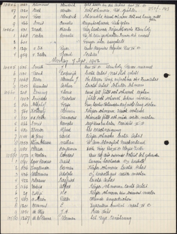 Arie Bom (# 937; 1895-?) beschreef hoe twee ontsnapte jonge Joden (in casu Leon Zadick # 1397, 1922-1942, en Jacques Jacobs # 382, 1924-1942) werden teruggevonden en voor de ogen van de op appèl staande gevangenen werden doodgeslagen. Bewaker Franzka had een Jood de schedel ingeslagen, trof hem vervolgens aan in de ziekenbarak en gaf hem de keuze tussen zichzelf ophangen of doodgeslagen worden; de man stierf kort daarna. Een andere bewaker, de Nederlandse SS’er Keizer bijgenaamd ‘Het Glazen Oog’, sloeg een Jood met een spade waardoor diens arm geamputeerd moest worden en de man stierf.37